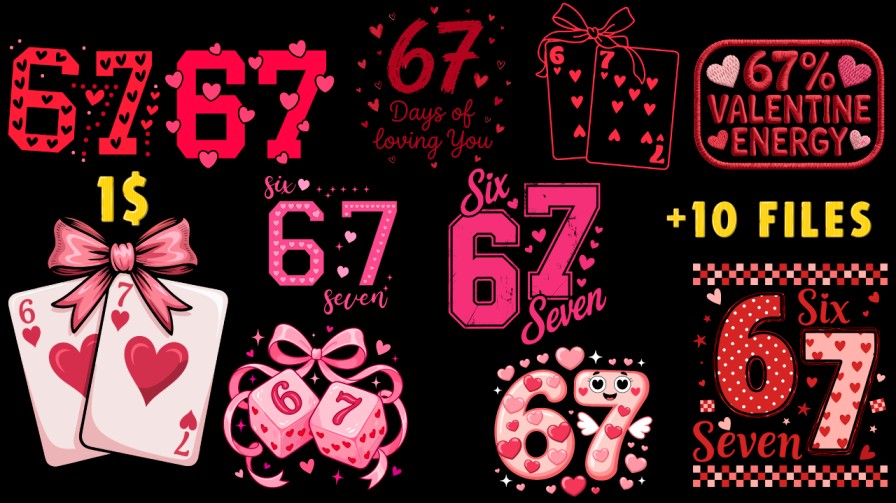 This mini Valentine bundle is perfect for trendy shirts, gifts, stickers, and digital projects inspired by the popular Six Seven (6–7) meme style.